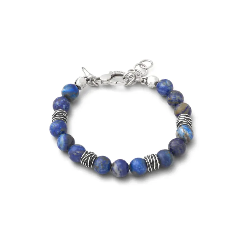 אלגנטיות של כחול. כדורים רבים מאבן לפיס לזולי מקיימים אינטראקציה עם אלמנטים קטנים בכסף יצוק מלוטש, שעווה אבודה, כדי להעניק חיים לצמיד זה לגברים. החלק המינרלי גובר על עיטור הכסף, כך שצבע הטבע הופך לאלמנט העיקרי. עבודת יד בבית על ידי Giovanni Raspini.