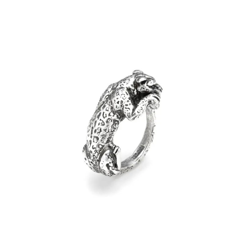 טבעת זו בולטת בזכות ההרמוניה יוצאת הדופן שלה, ומעוררת את כל הפיתוי החייתי של הנמר. עשוי מכסף מבריק, בטכניקת יציקת השעווה האבודה המסורתית, הוא עוטף את האצבע ויוצר טבעת אלגנטית במיוחד. עבודת יד איטליה.